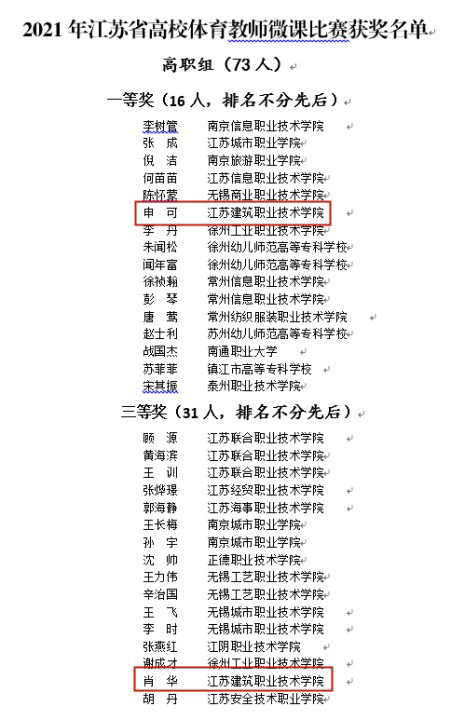近日,江苏省教育厅公示了2021年江苏省高校体育教师微课教学比赛获奖名单,bw必威西汉姆联官方网站申可、肖华两位老师分别获得高职组一等奖和三等奖。