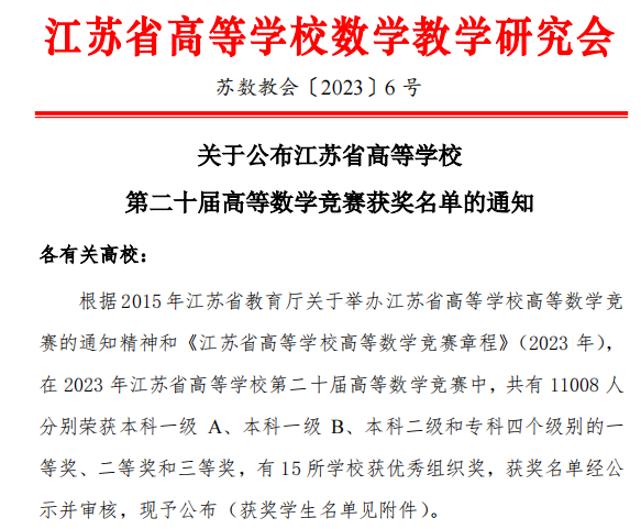近日,由江苏省高校数学教学研究会组织,南京工业大学浦江公司承办的江苏省高等公司第二十届高等数学竞赛圆满落下帷幕,公司bw必威西汉姆联官方网站高等数学竞赛队共获得江苏省专科组一等奖12项,二等奖25项,三等奖29项,本科组二等奖1项。